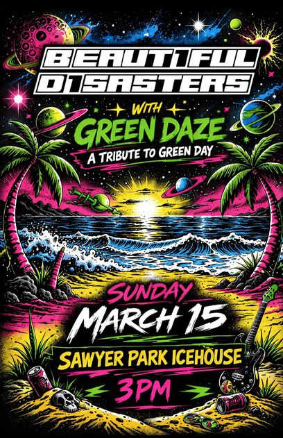 Get ready for an afternoon of high-energy alt-rock at Sawyer Park Icehouse as Beautiful Disasters & Green Daze take the inside stage on Sunday, March 14 at 3PM for Sawyer Shamrock Fest.