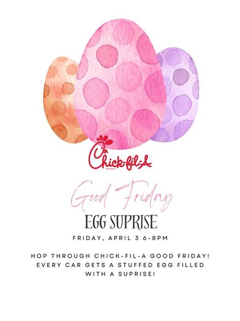 Hop through Chick-fil-A at 720 Sawdust Rd. on Good Friday! Every car that comes through the drive thru 6pm-8pm will receive an egg filled with a surprise!