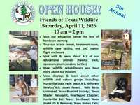 Fifth annual OPEN HOUSE! Saturday, April 11, 2026 from 10 am to 2 pm at Friends of Texas Wildlife Education Center, 29816 Dobbin Hufsmith Road, Magnolia, TX 77354. Come and go any time during those hours; $5 per person, kids 3 and under are free! No advance tickets are needed; pay at the gate.