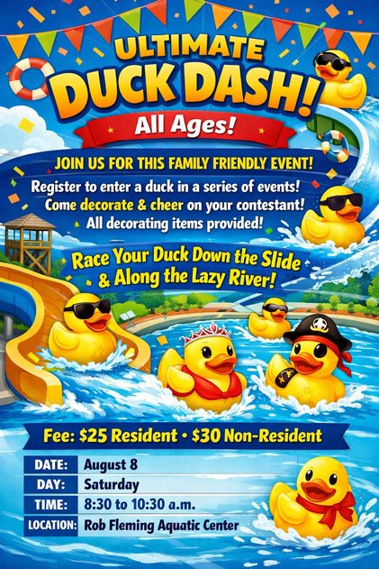 Join us for this family friendly event! Register to enter a duck in a series of events. Come to decorate and cheer on your contestant. All decorating items will be provided. Event includes racing your duck down the slide and along the lazy river.