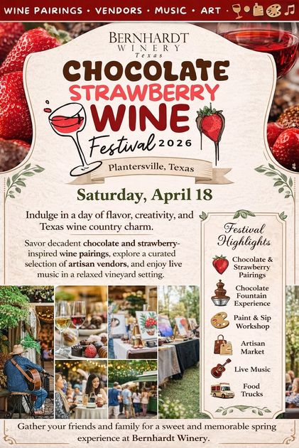 Savor decadent chocolate and strawberry-inspired wine pairings, explore a curated selection of artisan vendors, and enjoy live music in a relaxed vineyard setting.