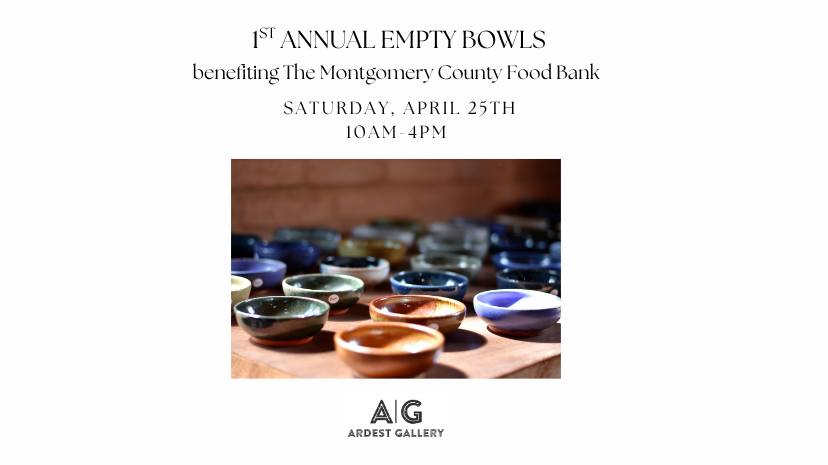 Join us for a day of art, community, and compassion. In partnership with the Montgomery County Food Bank, our gallery will host a special Empty Bowls event featuring hand-crafted ceramic bowls created by local artists, artisans, and students — each available for a donation of $25, with 100% of proceeds benefiting the food bank. Select larger works will be featured at higher price points, also with all proceeds going directly to hunger relief.
