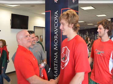 Sinchak segued back to lacrosse, gazing out at his audience he asked, "Where's your goalie?" Senior Hayden Stanifer raised his hand and the speaker acknowledged him in saying, "You had a tough day, son," to which Stanifer responded, "Yes, sir." Sinchak continued, "You know what? You never gave up and you came back with your team. You showed courage. You had hope. As people, we aren't beaten until we quit trying."