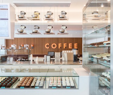 The venue will merge their popular cupcake offerings with a barista-style coffee counter and pastry service. Designed by the same James Beard award-winning, NYC-based design and graphics firm AvroKO, who designed CRAVE Cupcakes locations, guests can enter CRAVE into one of two indoor areas that merge at the front. The Bakeshop & Coffee side features seating up to 30 along a wooden recessed wall that boasts a giant back-lit “COFFEE” sign. It is flanked with large glass cases filled with housemade, baked fresh pastries including all butter croissants, cherry-pistachio scones, and gallettes to name a few.. There is also a grab-and-go area for items such as oatmeal and juices.