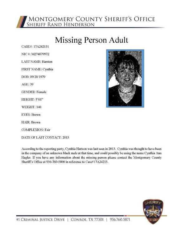 If you have any information about the whereabouts of Cynthia Hartson, please contact the Montgomery County Sheriff's Office at 936-760-5800 and reference Case Number 17A24215.