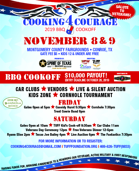 CONROE, TX – Since 2015, the Texans United for Freedom (TUFF) has hosted a barbeque cook-off, Cooking4Courage (C4C), to honor our Veterans, heighten awareness, and raise funds for PTSD recovery, re-acclamation and employment as a civilian, and offer supportive services to local veterans, active military, and first responders. Presented by Spirit of Texas Bank, C4C will be Friday, November 8 at 5:00pm and continuing all day Saturday November 9 from 10:00am until after 9:00pm.