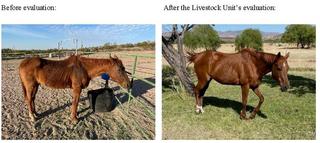 We understand horses are very important family companions, and protecting their health is incredibly important. If you notice your horse has lost weight or its behavior has changed, please call us at 936-760-5800. We are fortunate to have the training and experience as well as the resources to come out and evaluate your horse, the feeding regiment, and your property. This service will assist you with formulating a plan to help you maintain the health of your horse. Featured below is a transforming example of our services:
