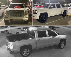 SPRING, TX -- The Montgomery County Sheriff’s Office is attempting to locate a stolen 2017 GMC Sierra Denali pickup, displaying Texas license plate PCZ2381 and VIN 3GTU2PEJ1HG292206. The vehicle is a white 4-door truck with black running boards, black aftermarket rims, and a black GMC decal on the front (top photos). The vehicle is believed to have been stolen on August 20, 2021, from the 2000 block of Hughes Landing in Spring, Texas. The suspects left the location in a gray or silver newer model Chevrolet Silverado pickup (bottom photo) .