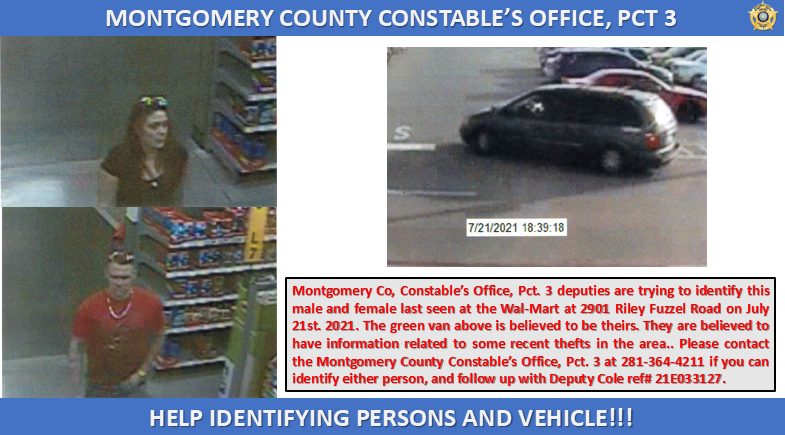 Please contact the Montgomery County Constable's Office, Pct 3 at 281-364-4211 if you can identify either person, and follow up with Deputy Cole reference # 21E033127