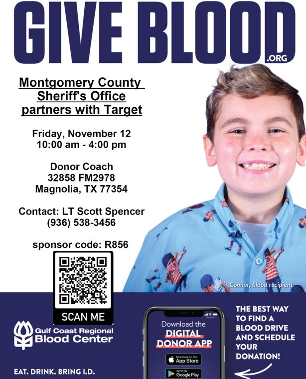 MAGNOLIA, TX -- On November 12, 2021, between 10:00 AM - 4:00 PM, the Montgomery County Sheriff’s Office is proud to partner with Target in Magnolia and Gulf Coast Regional Blood Center to host a blood drive in the parking lot of Target located at 32858 FM 2978 in Magnolia, Texas. Each pint of blood collected can help save up to three lives – what better way to pay it forward and make an impact on people in our community!