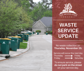 THE WOODLANDS, TX -- In observance of the Thanksgiving holiday, The Woodlands Township reminds residents that there will be no solid waste collection services on Thursday, November 25, 2021.