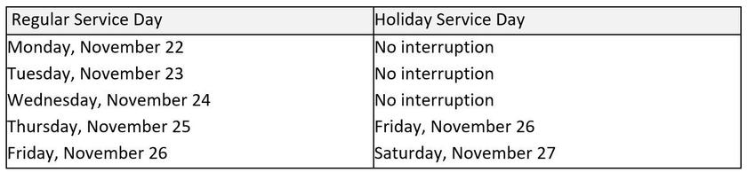 Curbside service will resume on Friday. Households with standard Thursday or Friday service will receive service the following day. These schedule changes impact all collections—trash, recycling, yard trimmings, and bulk pick-up.