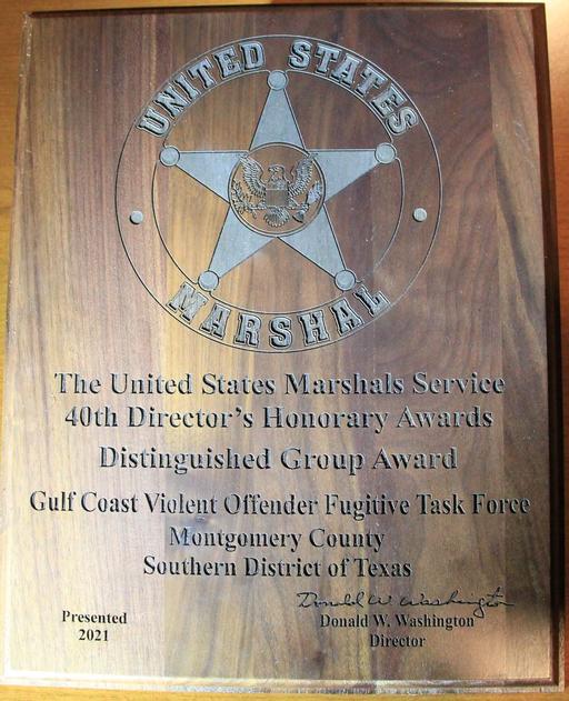 MONTGOMERY COUNTY, TX -- The Montgomery County Sheriff’s Office is proud to be a part of the Gulf Coast Violent Offender Fugitive Task Force, which received the United States Marshals Service 40th Director’s Honorary Awards- Distinguished Group Award. The director’s award is the highest award presented to employees and citizens who performed in an exemplary manner or who have made significant contributions to the efficiency and effectiveness of the US Marshal Service.