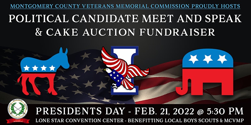 THE WOODLANDS, TX – The Montgomery County Veterans Memorial Commission is hosting a nonpartisan political event for citizens and veterans to familiarize themselves with candidates. The Political Candidate Meet-&-Speak and Cake Auction will take place at the Lone Star Convention Center on Presidents Day, February 21, starting at 5:30 p.m. Members of the public are invited – and encouraged – to attend this free event.