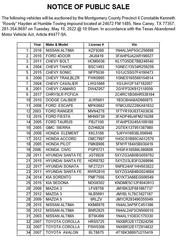 MONTGOMERY COUNTY, TX -- The following vehicles will be auctioned by the Montgomery County Precinct 4 Constable Kenneth “Rowdy” Hayden at Humble Towing impound located at 24672 FM 1485, New Caney, TX 77357, 281-354-8697 on Tuesday, May 10, 2022, @ 10:00am. In accordance with the Texas Abandoned Motor Vehicle Act, Article #4477-9A. Please contact the selling location for questions.