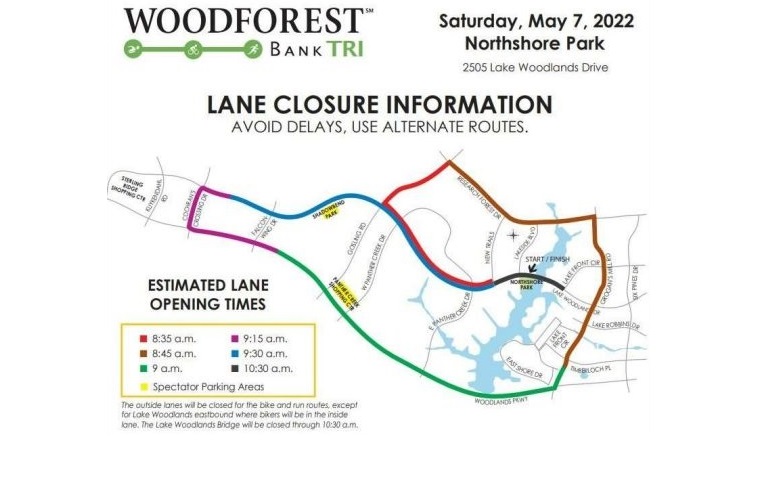 Complete information, including estimated lane openings, can be found on the Traffic Information link on the Township’s Woodforest Bank TRI race web page, www.thewoodlandstownship-tx.gov/450/Traffic-Impact. After the race starts, roads will reopen on a rolling basis as soon as the last participant has passed, and all course support materials have been removed. These particular areas will be congested throughout the event, and residents are encouraged to use extreme caution while traveling throughout the course.