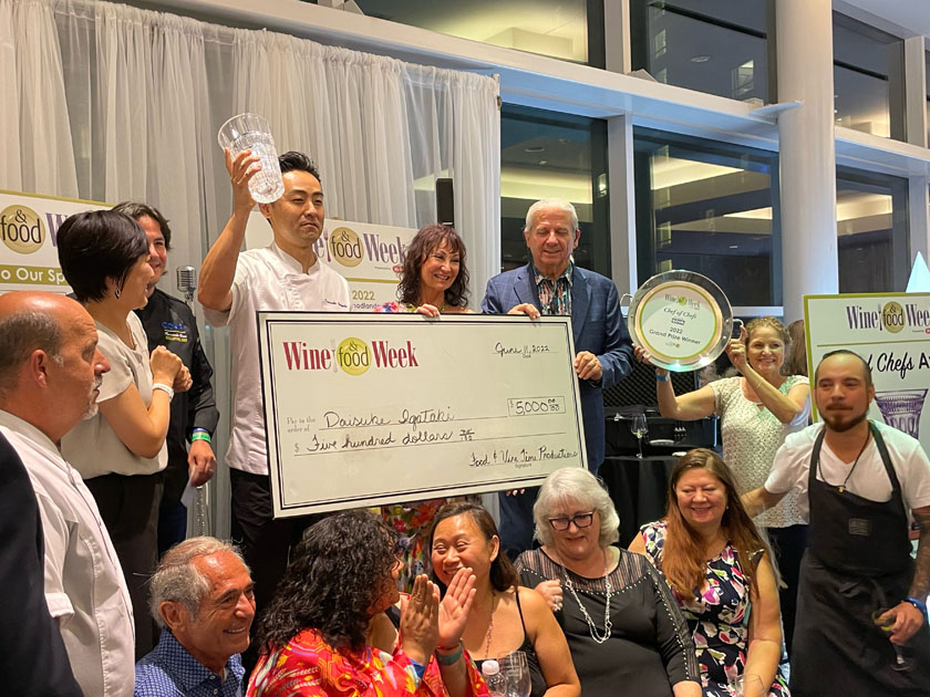 32 chefs from around the country competed for the esteemed Chef of Chefs Culinary Award and the bragging rights as top chef for Wine & Food Week 2022. According to Wine & Food Week, “Chef Daisuke Igataki, from Shimogamo in Chandler, Arizona took top honors including a $5,000 cash prize along with the Waterford Crystal Trophy presented by GOYA Foods. His dish was a reconstructed Japanese sukiyaki simmered A5 Miyazaki Japanese Wagyu Shoulder in sukiyaki style with soy, sake, and mirin. The eggshell bottom was the sukiyaki wagyu filled with dashi, egg foam topped with charcoal crisps, shiso leaf, shiso flower and salted ikura. First runner-up was Chef Urvin Croes with Infini Aruba for his Tuna Tartar. A tartelette made with seaweed, served with a tuna tartar, orange crème, ponzu gel, and furikake. Second runner-up was Chef David Skinner of eculent for his 44 Farms Sirloin served with a duck fat confit potato, grilled morel mushroom and foie gras cognac morel cream sauce.”