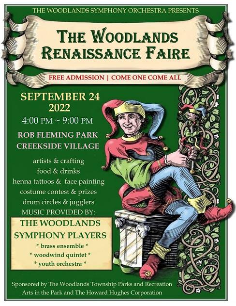 THE WOODLANDS, TX -- Join us on Saturday September 24th from 4-9pm for the first-ever Renaissance Faire in The Woodlands. This TOTALLY FREE event is Hosted by The Woodlands Symphony, The Woodlands Township Parks and Recreation Arts in the Park and The Howard Hughes Corporation.