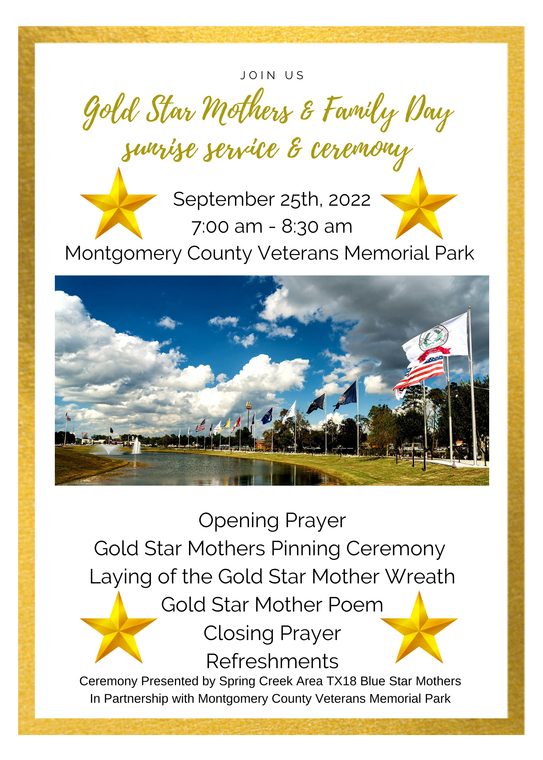 Please join Gold Star Moms and Families Sunrise Service for Gold Star Mother’s & Family Day at the Montgomery County Veterans Memorial Park, located at 1776 Freedom Blvd in Conroe, on the feeder road at I-45 north and Hwy 105 starting at 7:00am followed by refreshments. The ceremony hosted by Spring Creek Area TX18 Blue Star Mothers of America, Inc. and the Montgomery County Veterans Commission will include transitioning Blue Star Military Mom’s to Gold Star Moms Pinning Ceremony, a presentation of the Gold Star Wreath in recognition of the Fallen Service Members, and a short service. All military families, veterans, and the public are welcome to attend.