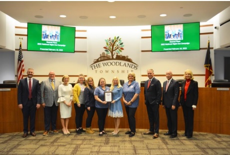 The Woodlands Township Board of Directors recognized Township Neighborhood Services for placing second in the National Association of Town Watch’s National Night Out Competition for 2022. From left, Vice Chairman Kyle Watson, Director Bob Milner, Secretary Linda Nelson, Neighborhood Services Manager Kristin Pternitis, Program Specialist Alex Cosson, Program Coordinator Cindy Strawn, Chairman Dr. Ann K. Snyder, Program Coordinator Susan Martin, Director Brad Bailey, Treasurer Richard Franks and Director Dr. Shelley Sekula-Gibbs.