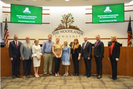 The Woodlands Township Board of Directors recognized Township Parks and Recreation staff members Amber Barnes, Tyler Little and Pamela Woods for winning the Texas Parks and Recreation Society (TRAPS) Star Performers of the Year award. From left, Vice Chairman Kyle Watson, Director Bob Milner, Secretary Linda Nelson, Program Coordinator Tyler Little, Assistant Director of Parks and Recreation Pamela Woods, Chairman Dr. Ann K. Snyder, Recreation Supervisor Amber Barnes, Treasurer Richard Franks, Director Brad Bailey and Director Dr. Shelley Sekula-Gibbs.