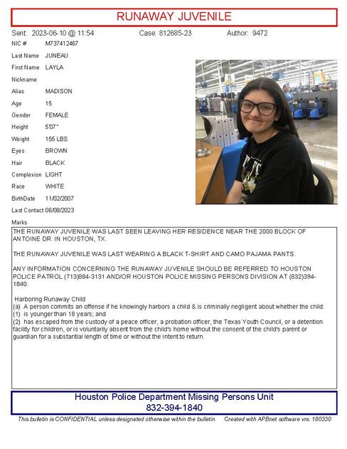 HOUSTON, TX -- At the request of the Houston Police Department Missing Persons Unit, please be on the lookout for 15-year-old Layla Juneau.