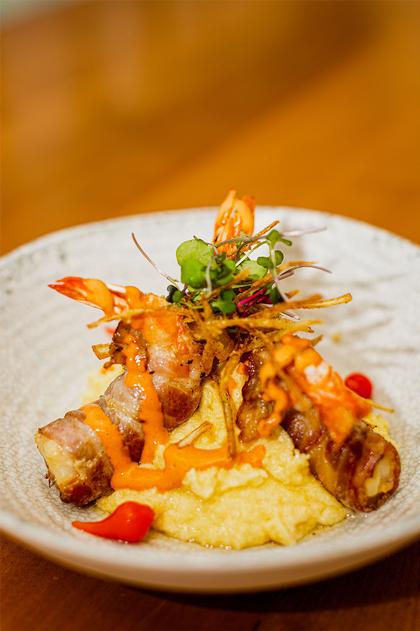 Plantain Chips Shrimp & Grits – Bacon-wrapped, smoked gouda, Amarillo aioli, fried leeks,