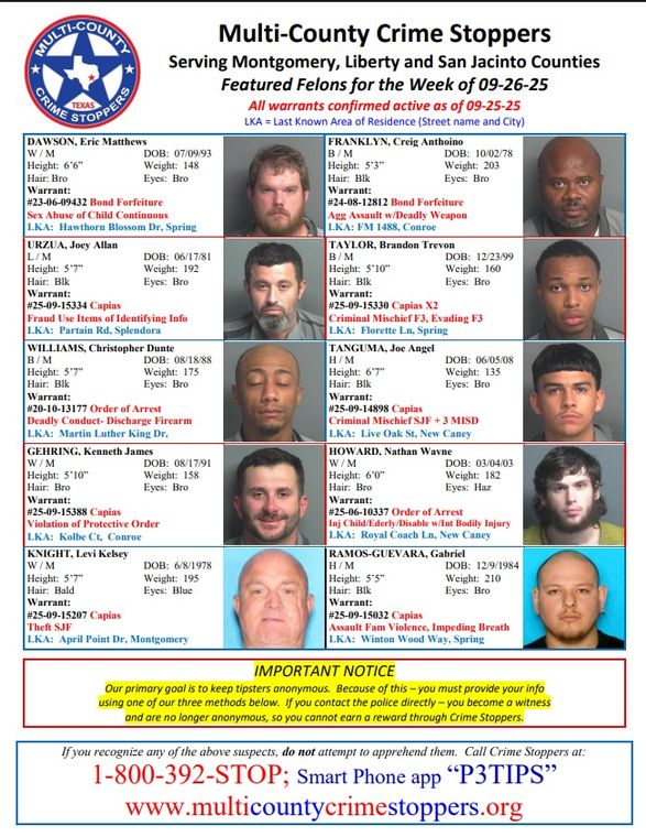 MONTGOMERY COUNTY, TX -- Serving Montgomery, Liberty and San Jacinto Counties. Featured Felons for the Week of 09-26-2025. All warrants confirmed active as of 09-25-2025.