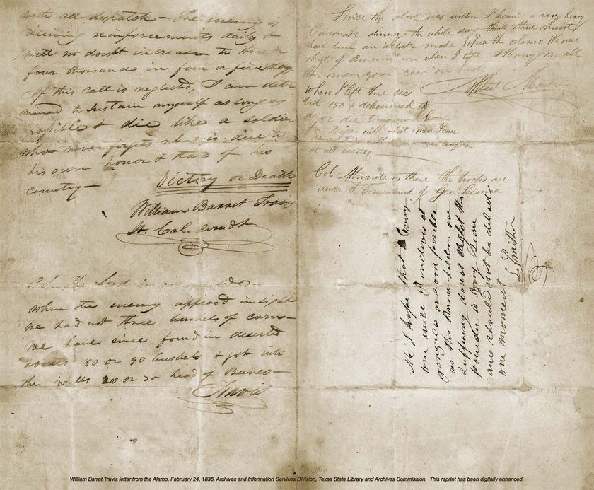 I am besieged, by a thousand or more of the Mexicans under Santa Anna – I have sustained a continual Bombardment & cannonade for 24 hours & have not lost a man – The enemy has demanded a surrender at discretion, otherwise, the garrison are to be put to the sword, if the fort is taken – I have answered the demand with a cannon shot, & our flag still waves proudly from the walls – I shall never surrender or retreat. Then, I call on you in the name of Liberty, of patriotism & everything dear to the American character, to come to our aid, with all dispatch – The enemy is receiving reinforcements daily & will no doubt increase to three or four thousand in four or five days. If this call is neglected, I am determined to sustain myself as long as possible & die like a soldier who never forgets what is due to his own honor & that of his country – Victory or Death.