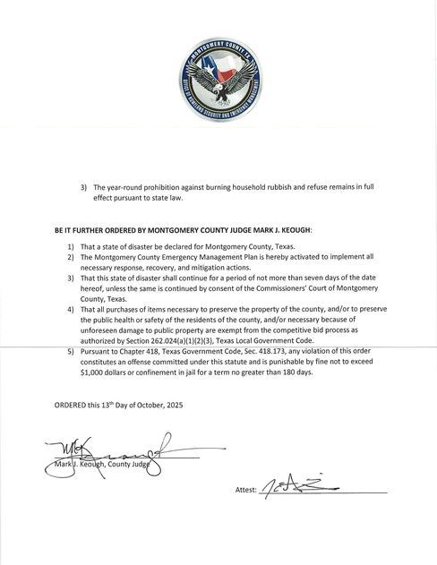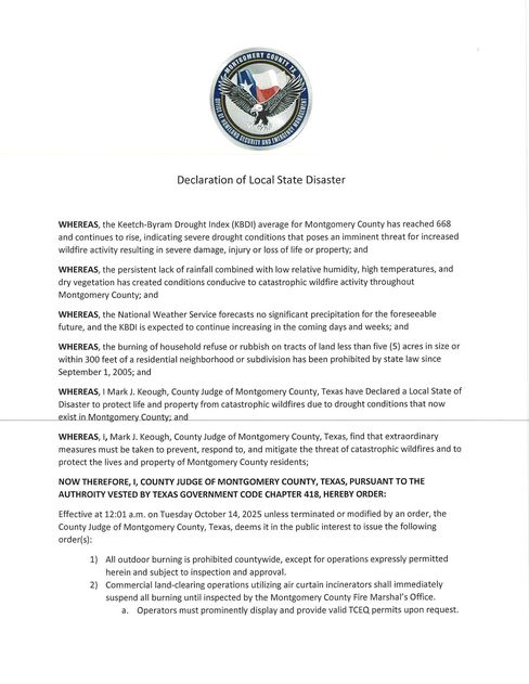 Due to rapidly worsening drought conditions and an elevated risk of wildfire across Montgomery County, I have signed a Declaration of Local Disaster and ordered all outdoor burning to cease effective 12:01 a.m., Tuesday, October 14, 2025, until further notice.