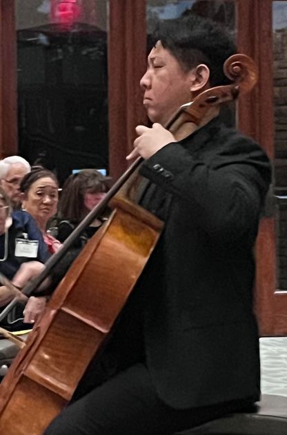 William Suh started his part of the evenings entertainment with several short form works, of course the first being Johann Sebastian Bach’s ‘Suite No. 3 in C Major, BMV 1009,’ with JSB being a master of the solo cello suite. The prelude opened with a broad arpeggiated gesture allowed by the smooth play of Suh’s arm and wrist movements. For the listener, you get a sense of joy, like being in an open space, enjoying the splendor of the sights, confident in your motions as the music moves you. William’s concentration is absolute when he is at one with his cello, an impressive and expensive century’s old instrument that is worth several hundred thousand dollars. Bach’s No. 3 is a bold piece, energetic, developing with a free flow, not forced, with a wonderful series of motif reinstatements that modulate with key changes that interest the listener. The coda, or ending, is brilliantly done, like a trucker jake-braking his rig to slow down with precision without having to apply the pedal. William’s grace and the beautiful play in his descent skills were excellently done, before returning to the C Major home key. Suh’s talent and the trust others hold in him, allows him to capture Bach’s vision and timeless vitality.