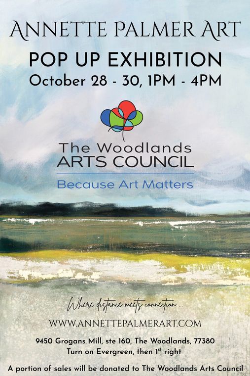 THE WOODLANDS, TX – The Woodlands Arts Council (TWAC) is pleased to present, “Where Distance Meets Connection,” a three-day pop up exhibition featuring the semi-abstract paintings of local artist Annette Palmer. The exhibition will be on display October 28-30, 2025, at the TWAC Gallery, open Tuesday through Thursday, 1:00-4:00 PM. Visitors will have the opportunity to meet the artist and explore her collection, which bridges the landscapes of her native Scotland with those of her home in Texas.