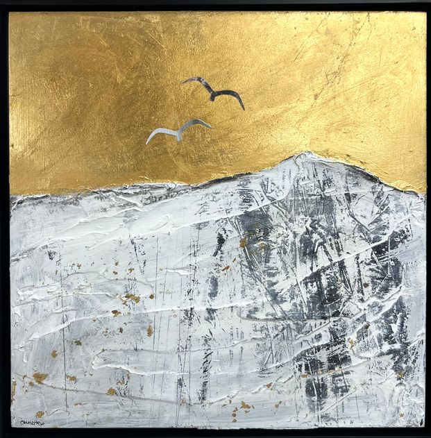 Her creative process blends experimental and established techniques, including collage, vintage papers, and reflective fragments. “These elements represent optimism, memories, hope, dreams, and spirits,” she adds. “Painting the past, present, and the heart.”