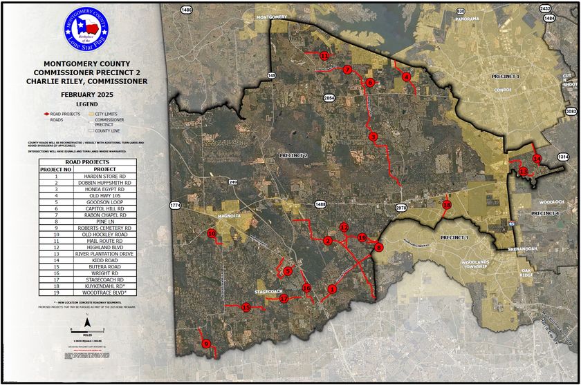 All projects listed under the Road Bond for Precinct 2 will be addressed as scheduling permits. Key considerations for initiating work include the absence of interference from ongoing external utility projects, the availability of construction crews, the procurement of materials from local suppliers, securing right-of-way permissions from landowners and railroad companies, and favorable weather conditions.