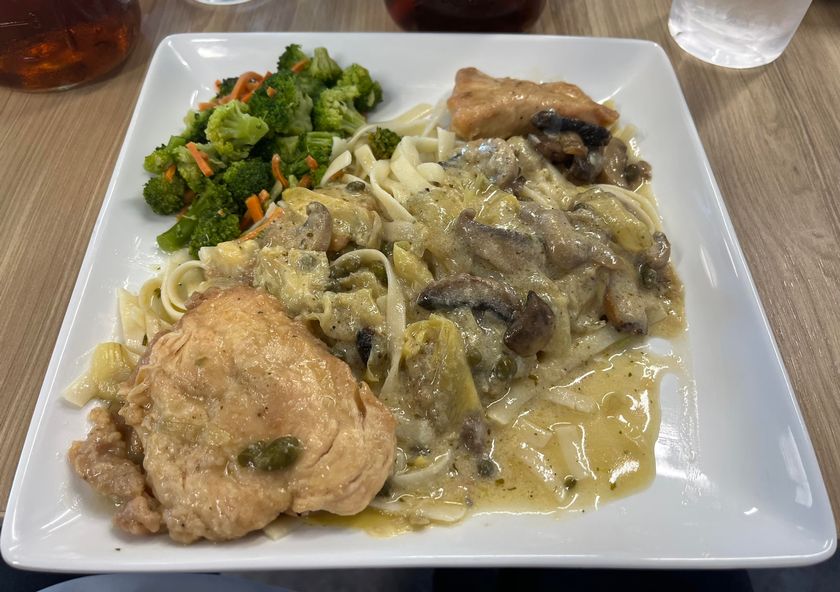 The entrée was Chicken Piccata with fettuccine and broccoli, which was incredible and perfectly seasoned. The broccoli was blanched and shocked with julienned carrots allowing for a wonderful presentation that allowed for a tender yet crisp bite, while still allowing for its beautiful color, and maintaining its healthy vitamin C, protein, and fiber intake. The fond and juices from the baked chicken are a great starter to the making of the sauce, which includes the ever present capers, chicken broth, lemon zest, mushrooms, garlic powder, butter, olive oil and heavy cream. The fettuccine and its accompanying sauce were excellent, needing no seasoning adjustment at all, and were heavenly with the chicken in the bite.