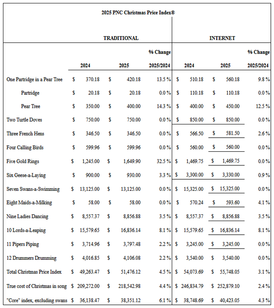 THE WOODLANDS, TX – The cost of celebrating Christmas is climbing again. Now in its 42nd year, the PNC Christmas Price Index (PNC CPI) reveals that the cost of the gifts from the classic holiday carol ‘The Twelve Days of Christmas’ has risen 4.5% compared to last year, outpacing the Bureau of Labor Statistics' Consumer Price Index (BLS CPI) October year-over-year reading of 3.0%.
