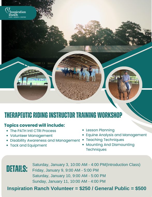 MAGNOLIA, TX -- Inspiration Ranch, a leading equine assisted therapy and activity non-profit, is excited to announce its upcoming Therapeutic Riding Instructor Training Workshop, a comprehensive session designed to deepen knowledge and skills in the field of therapeutic riding with Therapeutic Riding Education Coordinator, PATH Master Level Riding Instructor, CTRI and ESMHL Anthony Busacca.