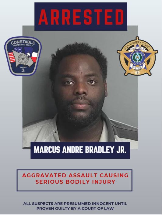 On January 9, 2026, Constable Gable’s detectives executed a search warrant at a residence as part of the investigation and gathered sufficient evidence to arrest Marcus Andre Bradley Jr. for Aggravated Assault Causing Serious Bodily Injury, which is classified as a second-degree felony. Bradley was then taken to the Montgomery County Jail.