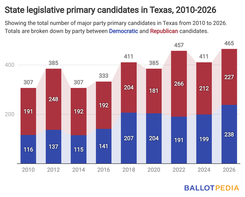 THE WOODLANDS, TX -- Texas has 465 major party candidates running for the Legislature on March 3, the most in any election dating back to 2010. There are 238 Democrats running, up 20% from the 199 Democratic candidates who ran in 2024. There are 227 Republicans running, up 7% from 212 in 2024.