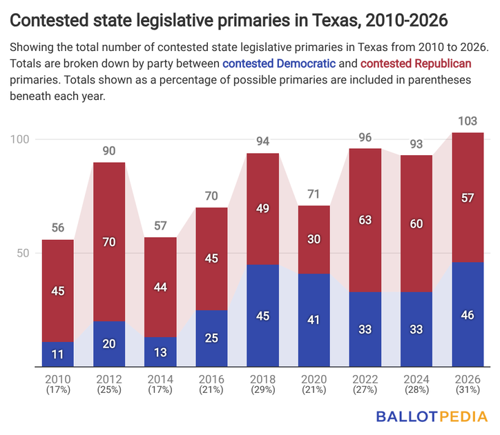 Texas has 103 contested state legislative primaries this year, an 11% increase from 2024 and the most since 2010. There are 46 Democratic primaries, a 39% increase from 33 in 2024 and a record high for the party. Republicans have 57 contested primaries, down 5% from 60 contested primaries in 2024.
