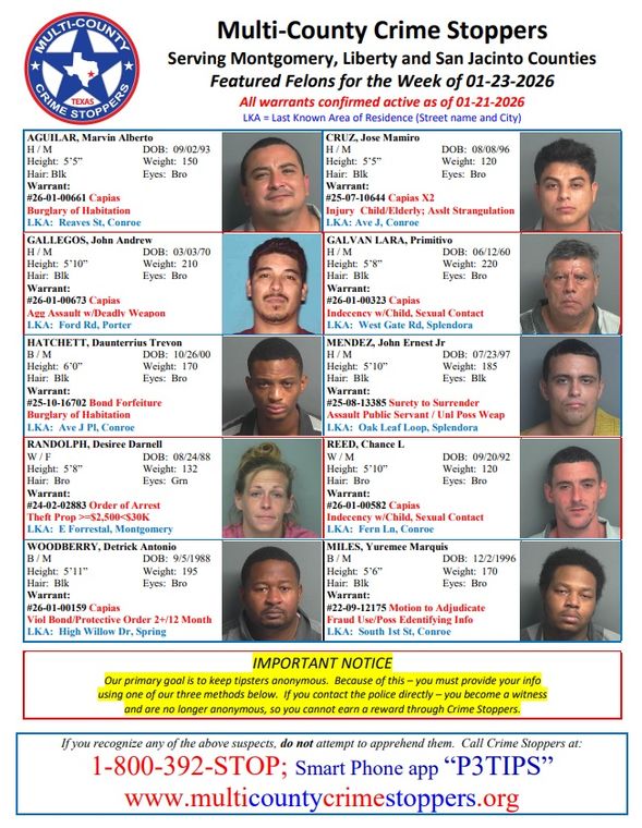 MONTGOMERY COUNTY, TX -- Serving Montgomery, Liberty and San Jacinto Counties. Featured Felons for the Week of 01-23-2026. All warrants confirmed active as of 01-21-2026.