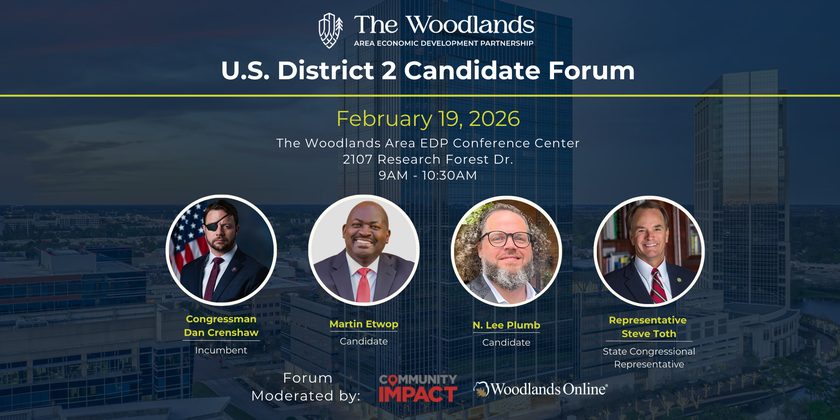 At the forum, the four candidates scheduled to appear will field primarily business- and economy-related questions from the two moderators in front of a live audience. The event will simultaneously be livestreamed by Woodlands Online on their website and social media. Due to limited seating, people wishing to attend should contact The Woodlands EDP offices at their earliest opportunity.