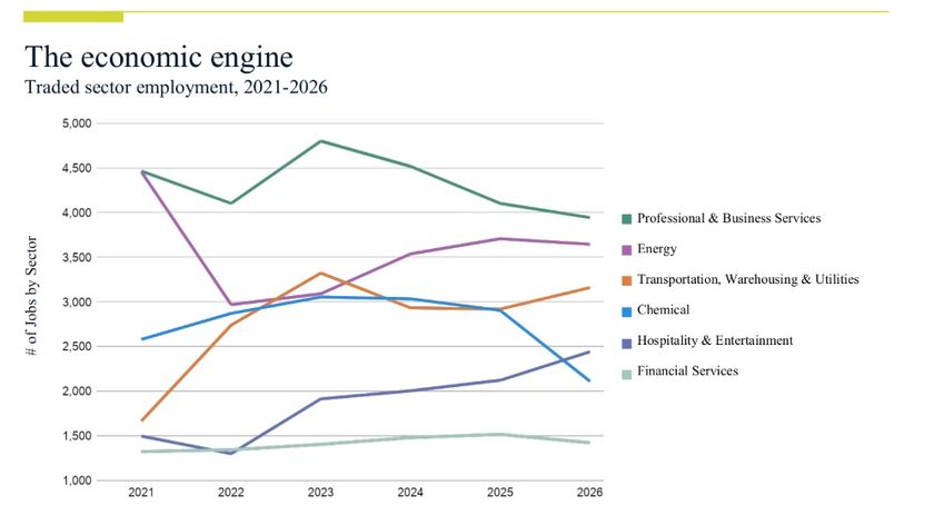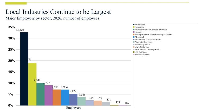 Gibb emphasized the distinction between local and traded industries in his presentation: "Healthcare and education serve the people who already live here. The real economic engines are our traded industries—Energy and Chemicals—that bring money into the region from global customers. Each job at a company like CP Chem or Arena Energy creates 2-3 additional jobs at hospitals, schools, and restaurants. The traded sectors are smaller, but they're the foundation everything else sits on."