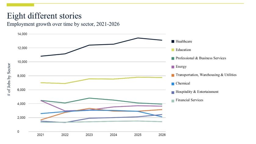This year's Major Employers Report recorded a combined total of 84 companies and 40,358 jobs, representing a 2% decline from 2025's total of 41,103 jobs. The decrease was driven primarily by a significant restructuring in the chemicals sector, which shed jobs as companies responded to overcapacity and margin pressure. Despite this adjustment, the region has demonstrated resilient long-term growth, with total Major Employer jobs increasing 33% over the past decade.