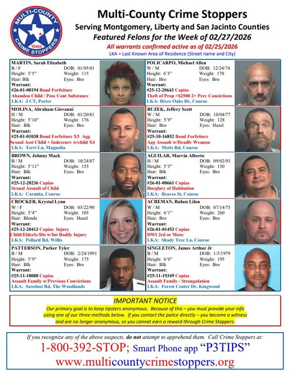 MONTGOMERY COUNTY, TX -- Serving Montgomery, Liberty and San Jacinto Counties. Featured Felons for the Week of 02-27-2026. All warrants confirmed active as of 02-25-2026.