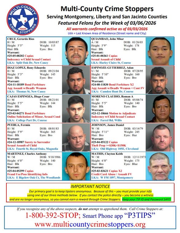 MONTGOMERY COUNTY, TX -- Serving Montgomery, Liberty and San Jacinto Counties. Featured Felons for the Week of 03-06-2026. All warrants confirmed active as of 03-03-2026.