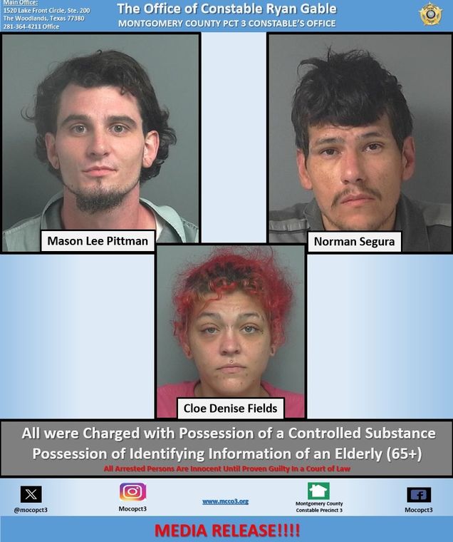 All three were charged with Possession of a Controlled Substance and Possession of Identifying Information of an Elderly Individual (65 years of age or older). Additional charges may be pending as the investigation continues. The vehicle was towed from the scene, and all individuals were transported to the Montgomery County Sheriff’s Office Jail, where they remain in custody.