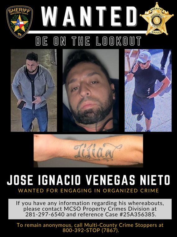 MONTOMERY COUNTY, TX -- The Montgomery County Sheriff’s Office is actively seeking Jose Ignacio Venegas Nieto, a 35-year-old Hispanic male. Nieto has a tattoo on his left forearm with the name “Lilian.”