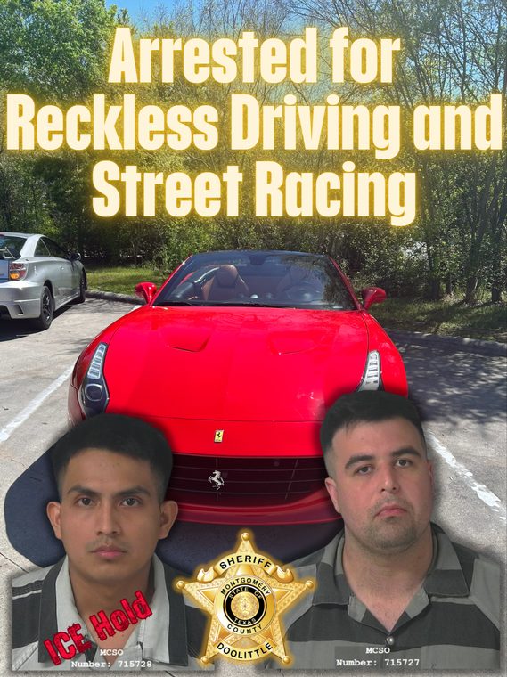 CONROE, TX -- On Friday, March 20, 2026 a Montgomery County Sheriff’s Traffic Enforcement Unit observed a red Ferrari speeding around the already congested traffic on Interstate 45 at a high, unsafe, rate of speed. As the Deputy moved to stop the Ferrari, he noted a silver Toyota Celica accelerating and attempting to overtake the Ferrari. Both cars maneuvered at high rates of speed, switching lanes rapidly and unsafely though the afternoon heavy traffic of I-45 near River Plantation.