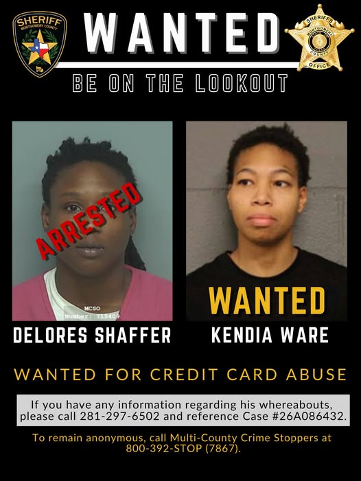 The investigation began on March 12, 2026, after a Burglary of a Motor Vehicle was reported at Bear Branch Sports Park located at 5200 Research Forest in The Woodlands. The victim’s wallet was stolen during the incident, and shortly thereafter, her credit cards were used fraudulently at a Target in Harris County and a Walmart in Montgomery County. Deputies with the Crime Reduction Unit were able to obtain video surveillance from both retail locations, which led to the positive identification of 29-year-old Delores Shaffer and 28-year-old Kendia Ware.
